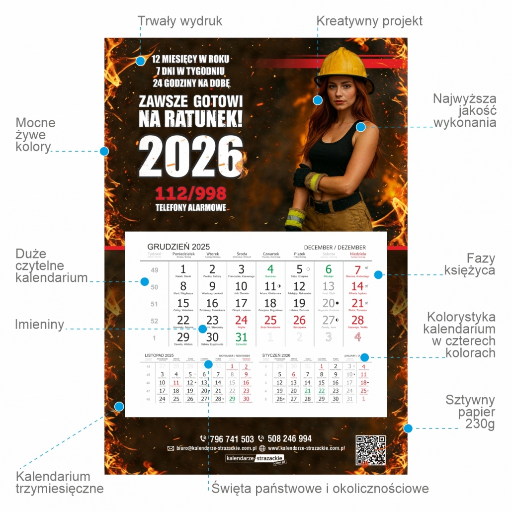 - wybrane przez Państwa zdjęcia z akcji, zawodów strażackich, grupowe, wozów strażackich, a także podziękowania, loga sponsorów, numery awaryjne